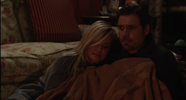 Viewers recently got an added treat—during a terrible storm in Genoa City, Nick and Sharon were stranded in Sharon’s home and had to snuggle under blankets, in front of a roaring fire, to stay warm. Neither seemed to find this awkward, or inappropriate, until Sharon’s current husband, Dylan (Steve Burton) walked in, clearly taken aback by the intimate scene.